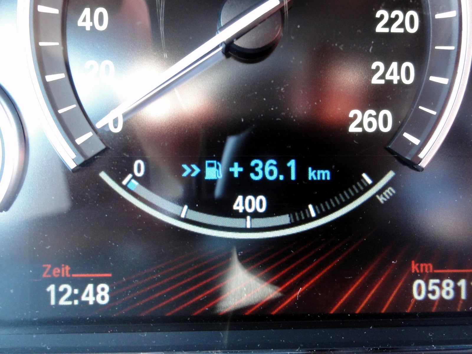 | The red line indicates how much kilometers can be drivin on the remaining fuel in the tank, in this case 1218 kilometers |